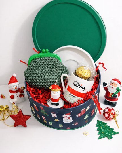 Metal Yılbaşı Hediye Kutusu – El Örgüsü Cüzdan & Kahve Fincanı